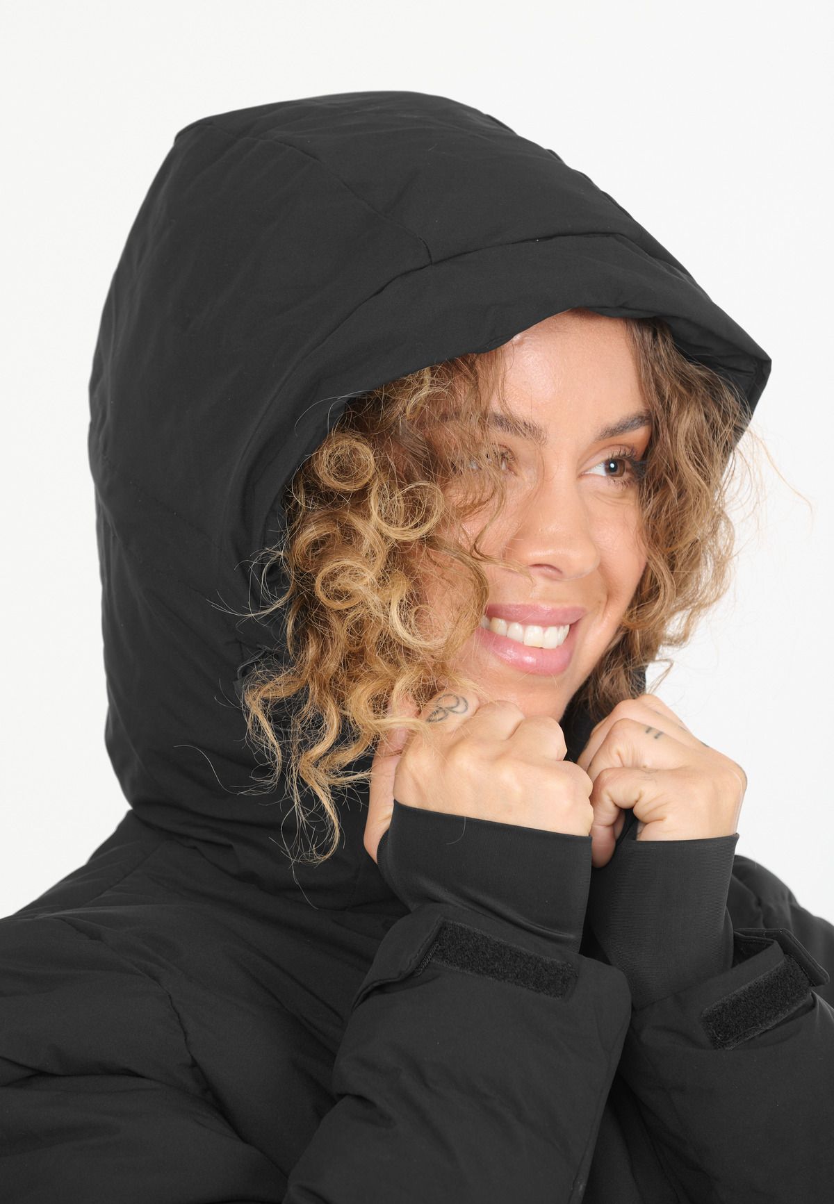 - Hood with drawstring