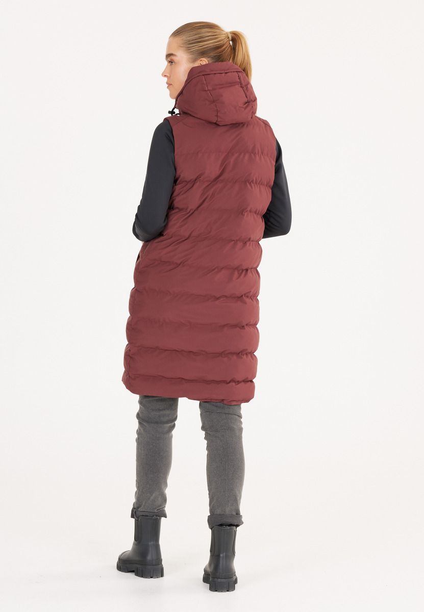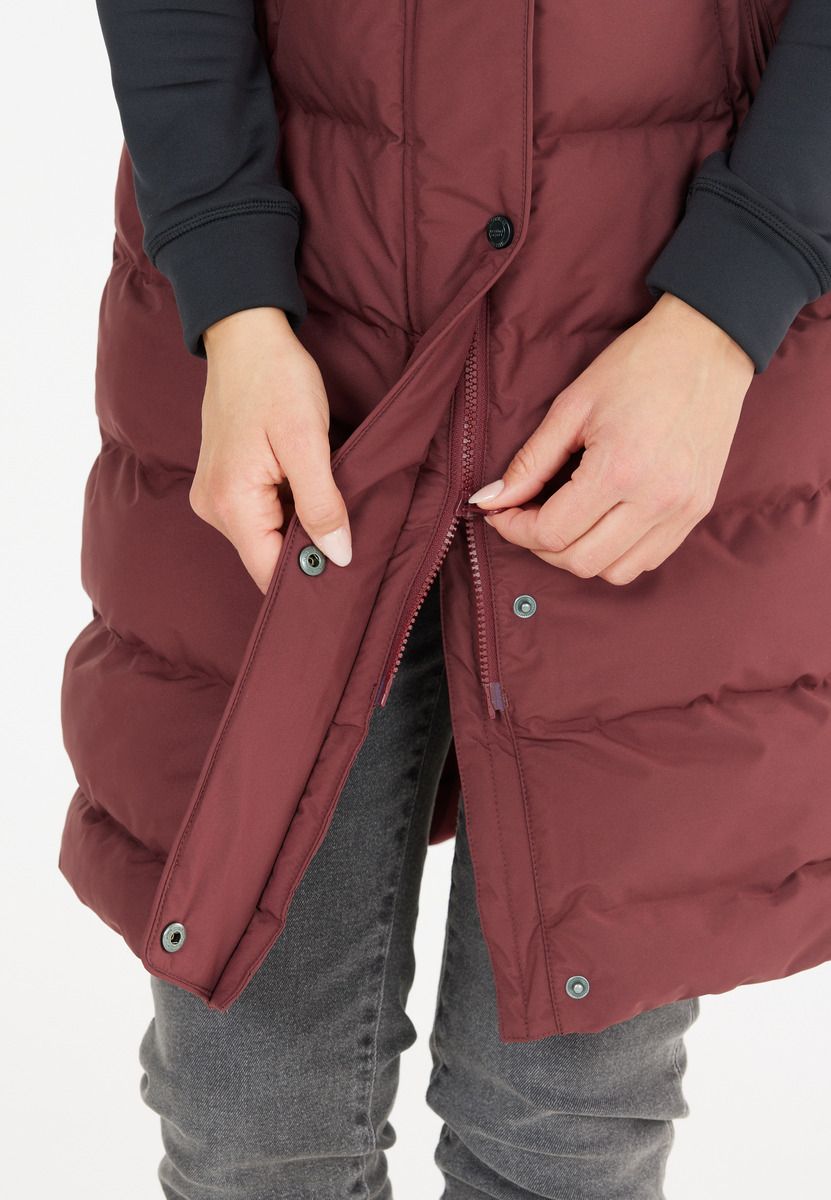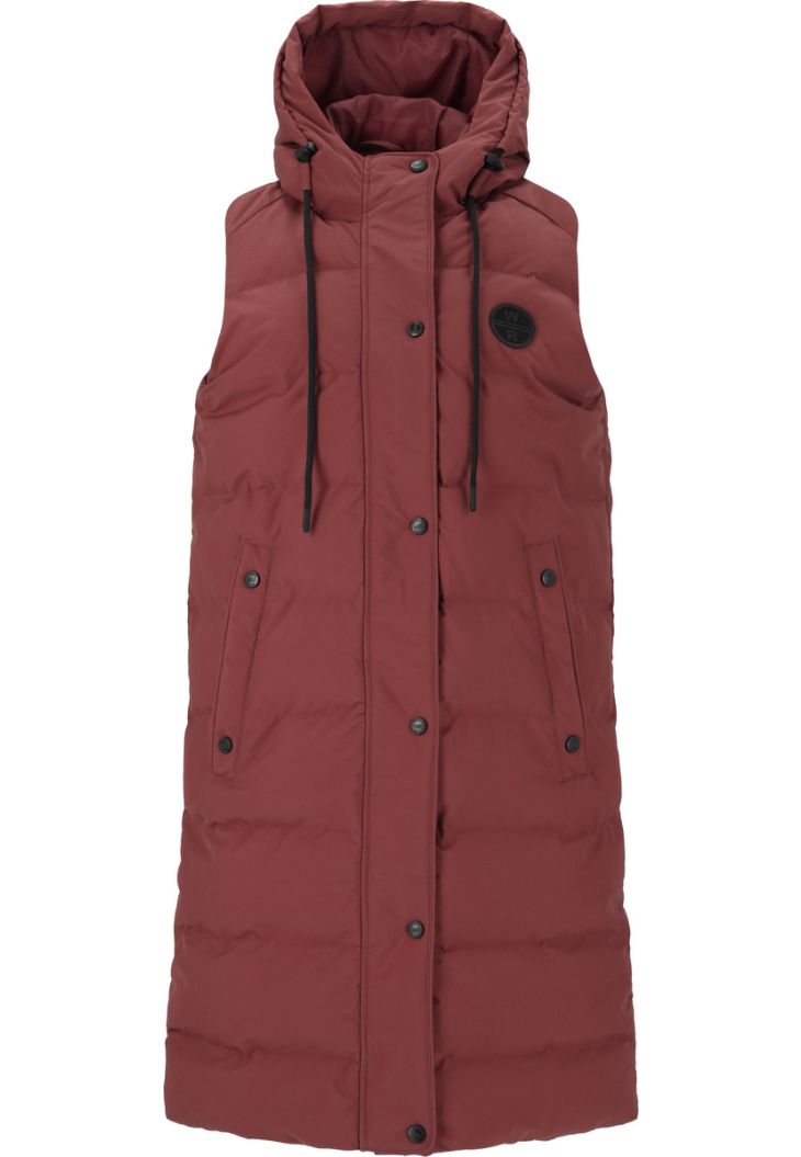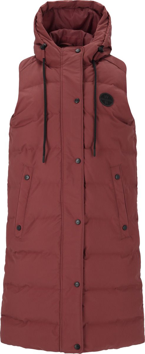 Not only are quilted jackets super popular this autumn and winter, quilted vests are also making a big appearance - like this classic model from Weather Report for women. It is ideal for cold days because, thanks to the long cut, it keeps not only the upper body but also the thighs pleasantly warm. A soft stand-up collar reaches down to under the chin, while the practical hood can be perfectly adjusted to the head thanks to a drawstring - so wet and cold weather doesn't stand a chance. The breathable quilted vest has a classic zip on the front and also closes with a button placket - both keep the warmth optimally on the body and ensure cozy comfort. In slightly warmer temperatures, the model is great to wear outside, and in sub-zero temperatures it is a cozy companion indoors that you just want to snuggle up in.