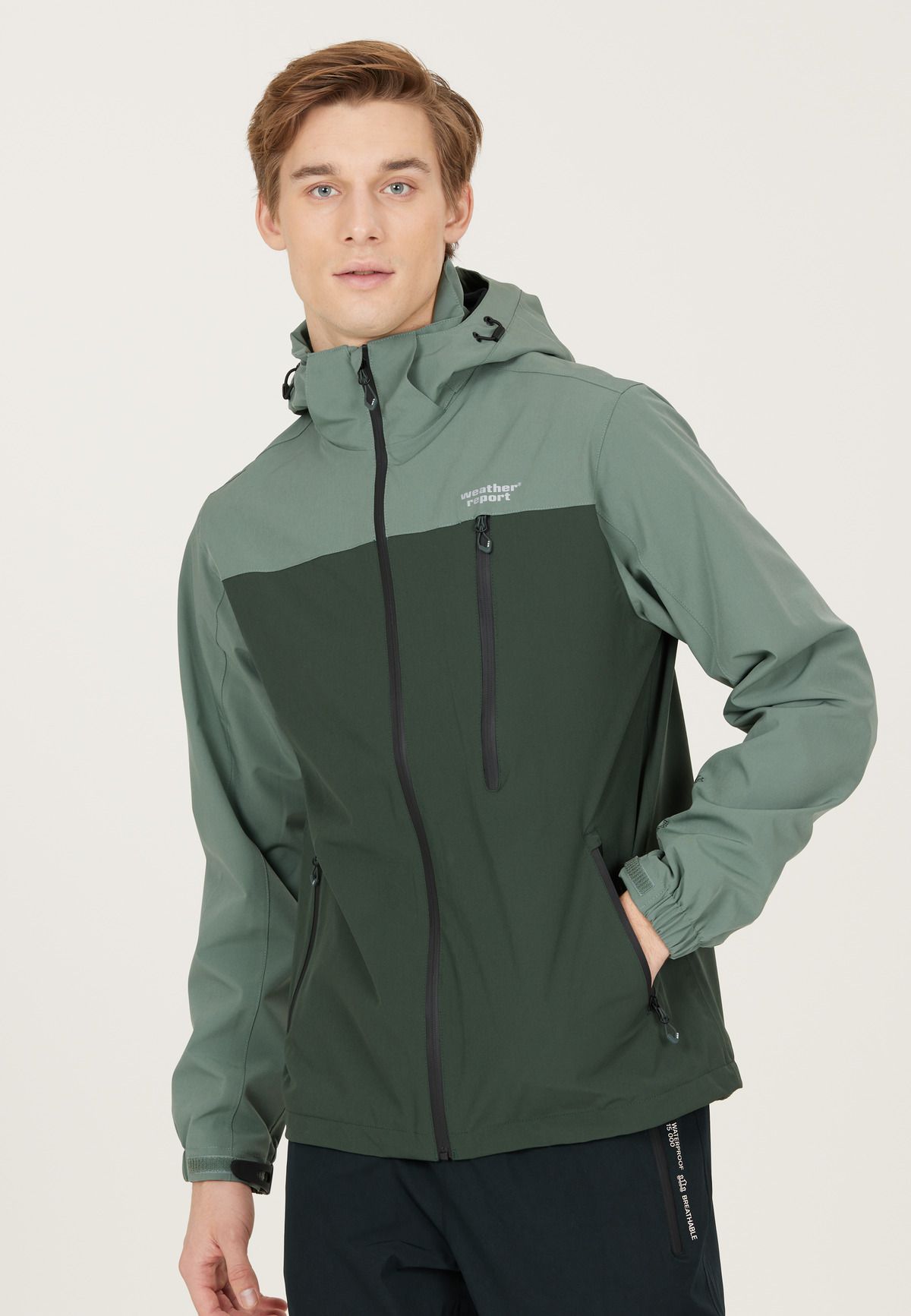 With the DELTON W-PRO15000 functional jacket for men by WEATHER REPORT from Denmark, you can enjoy your outdoor activities in any weather. The sporty design from Scandinavia underlines your trendy look. With the breathable and equally waterproof and windproof functional jacket with PU coating, you can defy any rain and weather thanks to a 15,000 mm water column. The PU coating used is environmentally friendly and PFC-free. The welded seams make the jacket 100% windproof and waterproof. The functional stretch made of polyester and elastane gives you good freedom of movement during your moves. Other highlights are: the high collar, an adjustable peaked hood, zip pockets on the side and on the chest, a YKK brand zip, Velcro fasteners on the sleeves and a reflective logo print. All of this makes the DELTON W-PRO15000 functional jacket for men by WEATHER REPORT a good companion for your outdoor activities. It also offers great value for money! The jacket is made from 94% polyester and 6% elastane.